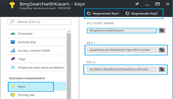 Click on Keys under Resource Management. This will list the key details (Key 1, Key 2), which we will be using in our application to leverage Bing Search API services.