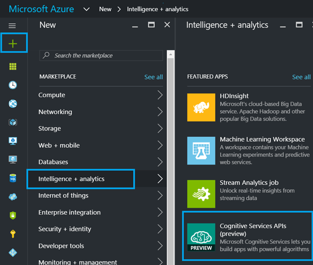 Once done with account creation, go to '+' => Intelligence + analytics => Cognitive Services APIs.