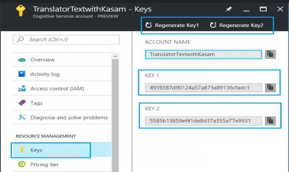 Click on Keys under Resource Management. This will list the key details (Key 1, Key 2), which we will be using in our application to leverage Translator Text API services.