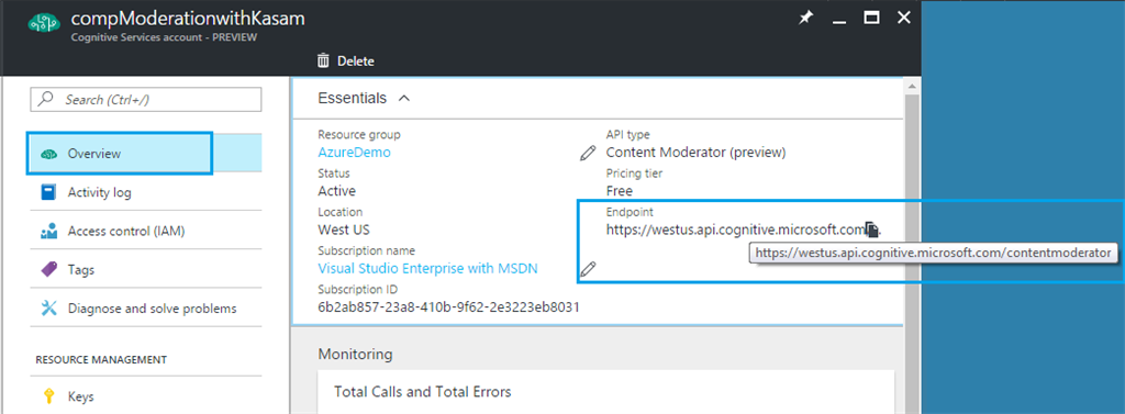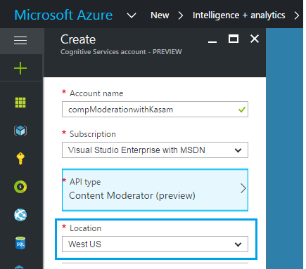 Currently, the service is in Preview and hence only available at Western US locations. Once we select Computer Moderator from the list of API types, the location would get set to ' West US'