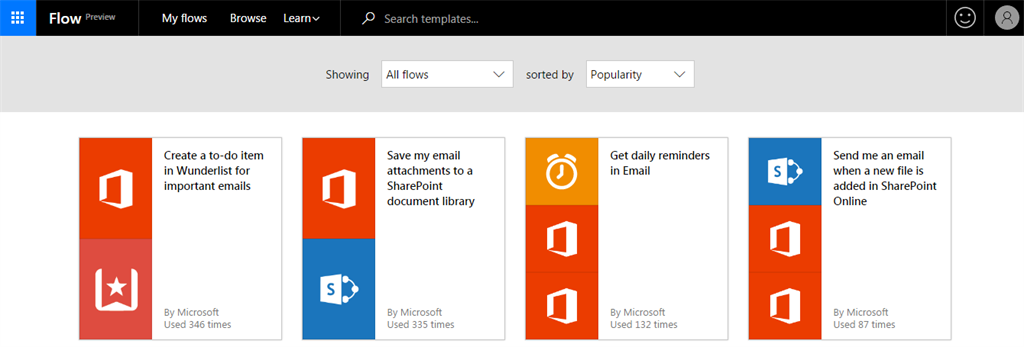Before jumping in to sample, Microsoft Flow ships with around 50 pre-defined templates. The templates can save our time and simplify our work life by connecting the services in a flow instead of starting from scratch.