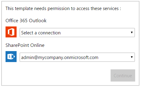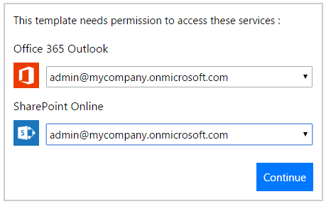 - Once the connection is established, Manage Permissions page looks like below, (for ex., I have used the same account to connect the Office 365 Outlook and SharePoint online). Click “Continue” start creating a new flow.
