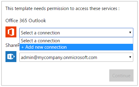- Now the system is redirected to the page,where you can create new connections to establish the permissions to access Outlook API and SharePoint Online API services.