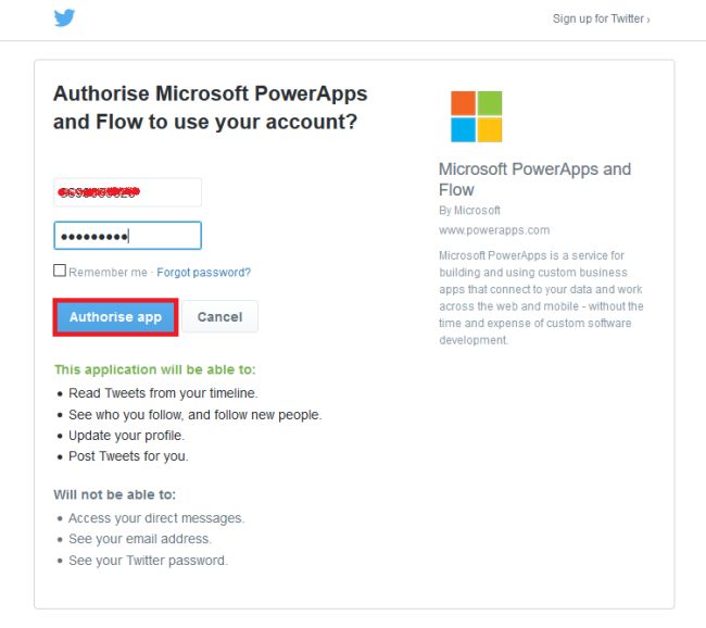 For connecting the Twitter account, it asks for authorization; press "Authorize app".