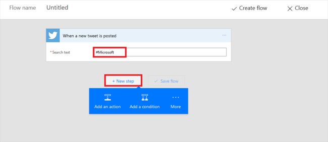 Also, we need to give the Keyword that can be searched in the Twitter account. Here, I gave #Microsoft; You can set it as per your choice. Now, click on the "Next Step" button to add an action to that flow.