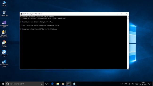 Now, open up the command prompt by pressing Windows + R keys and type cmd and press Enter. Navigate to the directory "C:\Program Files\MongoDB\Server\3.4\bin" by executing these commands,