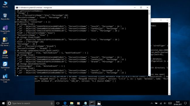 If the text "waiting for connections on port 27017" comes up, you will know the MongoDB server is up and running. Minimize this command prompt window and open up another command prompt window. Navigate to the same directory "C:\ProgramFiles\MongoDB\Server\3.4\bin" and fire up "mongo.exe".