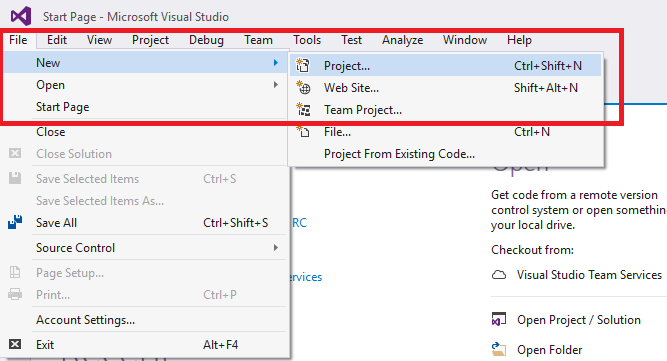 Open up Visual Studio 2017 RC then click File -> New -> Project.