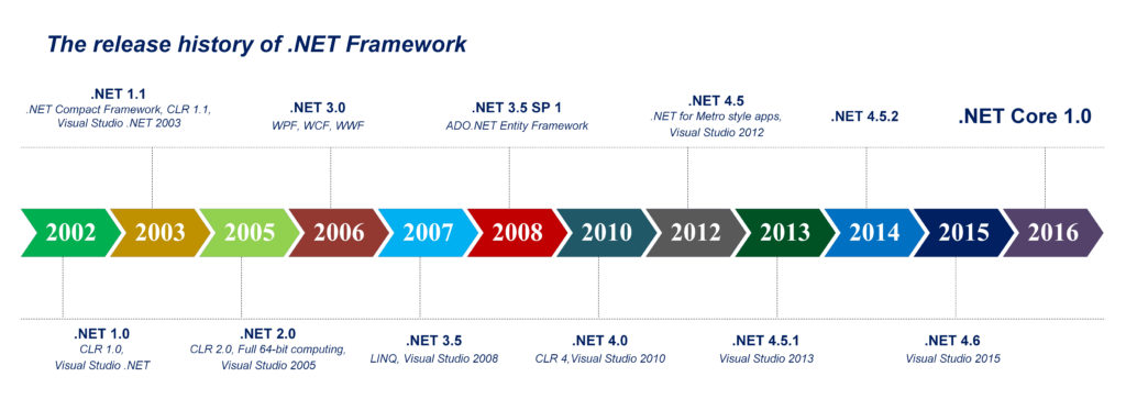 The era of .NET started in 2002, which runs on Visual Studio .NET and the initial version is .NET 1.0 and the latest version of .NET is .NET Core 1.0, which released on 2016 and supports Visual Studio 2015 and Visual Studio 2017 RC.
