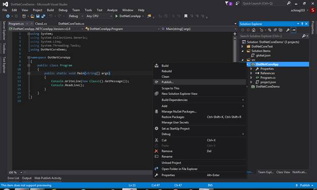 Right click on the project with the name “DotNetCoreApp” and click "Publish".