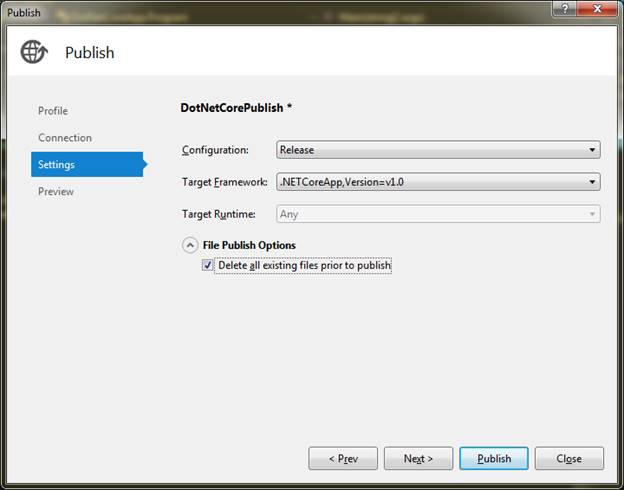 Now, you will get to the "Settings" tab. Leave all the options as they are. Expand only the “File Publish Option” and select the option “Delete all the existing files prior to publish”. This option will clear all the previously created files. This will make your deployment folder neat and clean with a fresh set of the files.