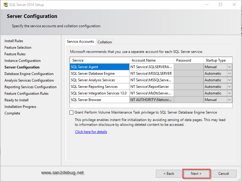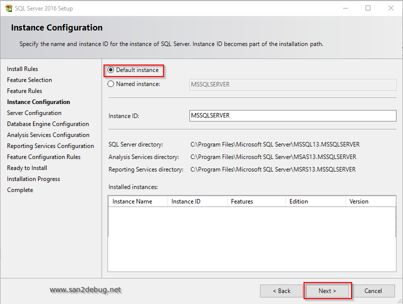 The Instance Configuration Window will open and verify the default instance check box is checked. Now, click Next button.