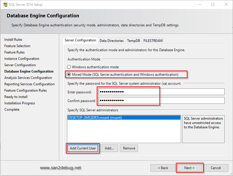 The database engine configuration Window will open and select the Mixed Mode radio button, which is checked. Now, type the password, confirm password and click 'Add Current User' button. Subsequently, click 'Next' button.