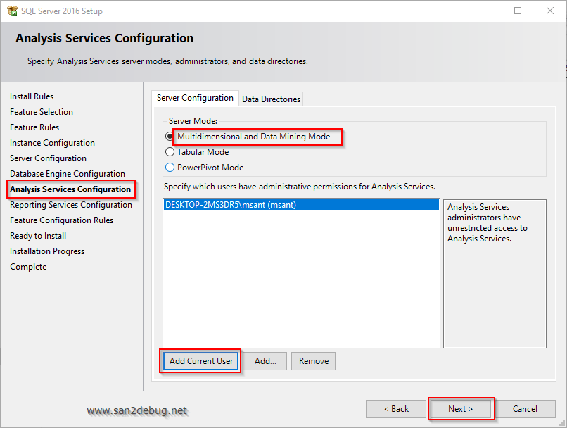 The Analysis Services Configuration Window will open, select the Multidimensional and Data Mining Mode radio button, which is checked. Click 'Add Current User' button and click 'Next' button.