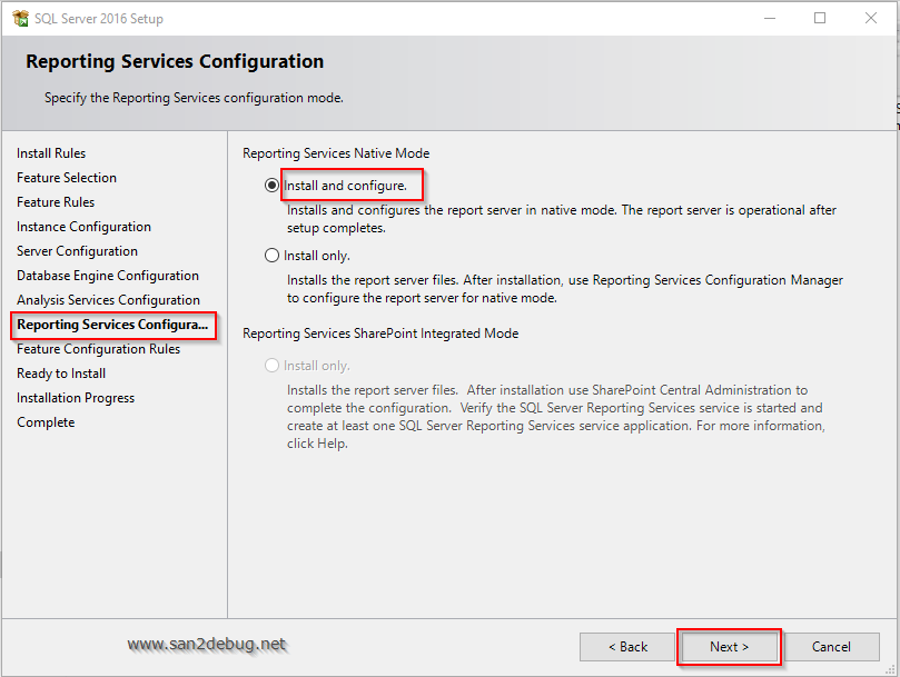 The reporting Services configuration Window will open and select 'Install and Configure radio button', which is checked. Now, click Next button.