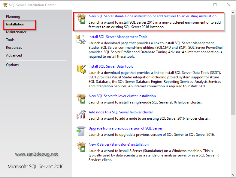 SQL Server Installation Center Window will open and select the Installation option. Click the New SQL Server stand-alone installation or add features to an existing installation option.