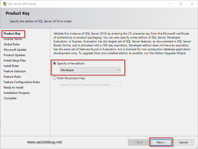 The Product Key Window will open and verify the developer free edition option. Subsequently, click the Next button.