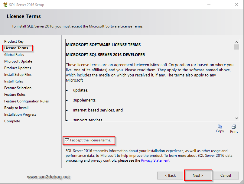 The License Terms Window will open, verify the license terms and select the check box of the license terms. Subsequently, click the Next button.