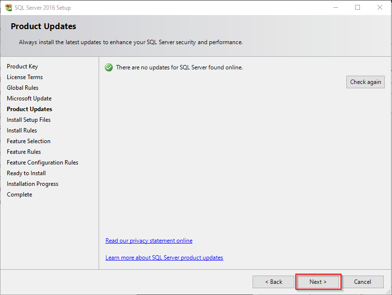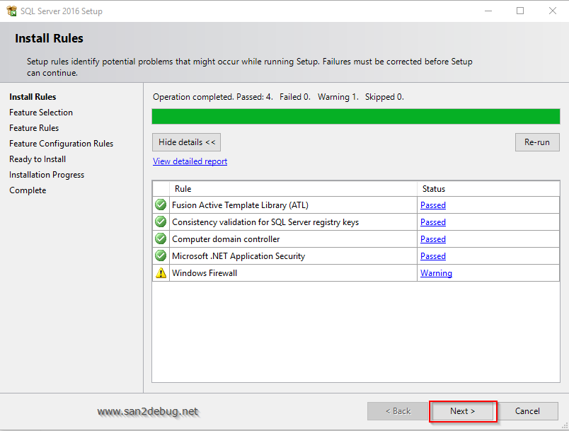 Install Rules Window will open and verify that all the install rules are passed (i.e. Windows Firewall enable to SQL Server port 1433). Subsequently, click Next button.