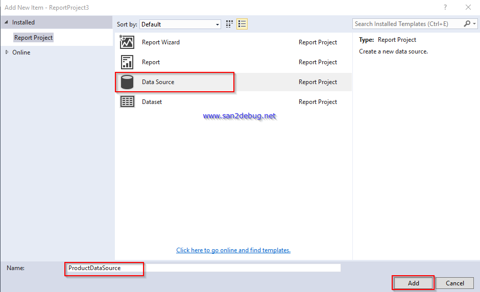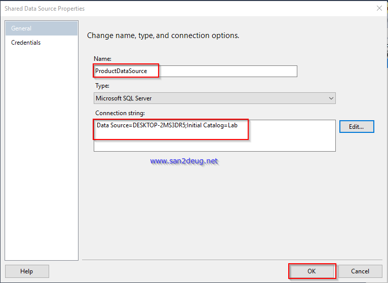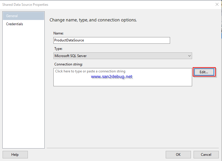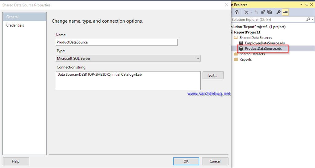 Go to Shared Data Source folder, click the ProductDataSource.rds data source name. Now, Shared Data Source Window will open, as shown below.