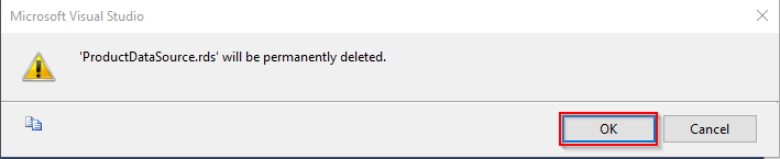 Microsoft Visual Studio Window will open and prompt delete confirmation option. Click OK button to delete the data source file, else click Cancel button to cancel the delete process, as shown below.
