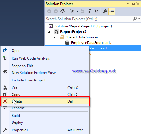 Go to Shared Data Source folder, right-click the ProductDataSource.rds and point to Delete context menu item, followed by clicking delete the item.