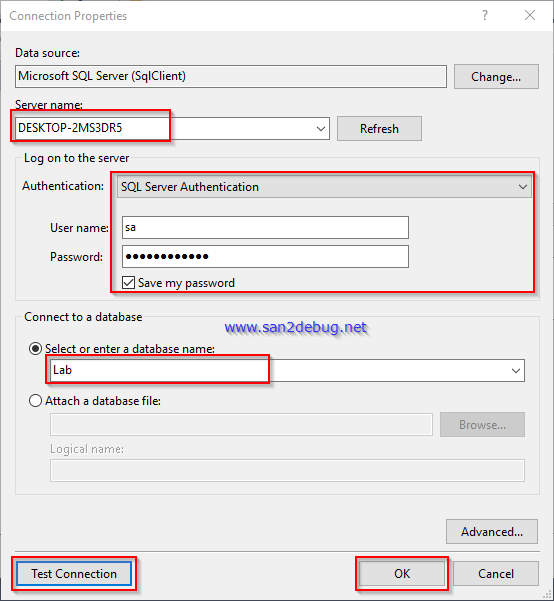 Connection Properties Window will open, type the Server name, select the Authentication, user name, password, select or enter a database name and finally, you can check the database connection succeed, followed by clicking the Test Connection button. Now, click OK button.