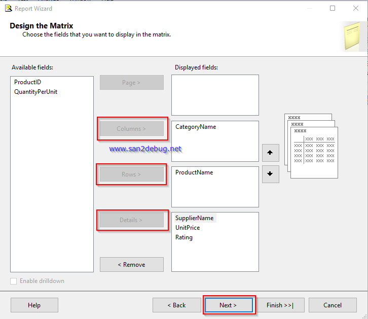 The Table design Window will open and add table columns, rows and details to display the fields, followed by clicking columns, rows, details button. Now, click Next button.