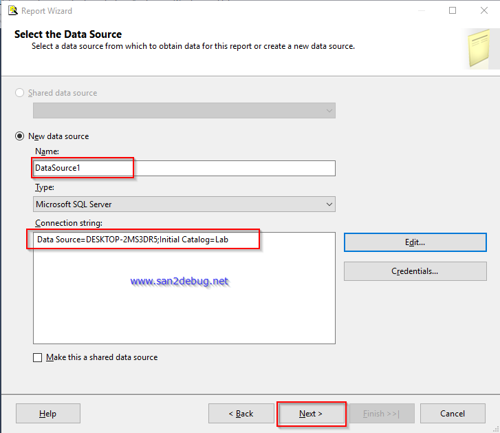 On selecting Data Source Window, it will open and select the new data source, connection string and click Next button.