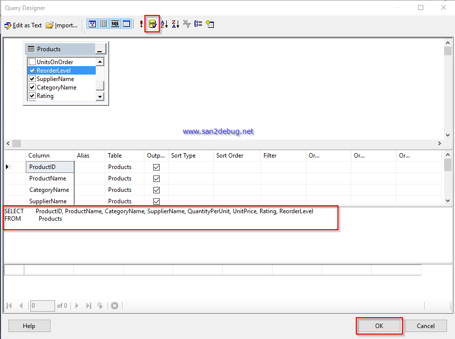 The Query Designer Window will open and type the query into the table you want to load the report and execute the SQL query, followed by clicking SQL icon. Now, click OK button.