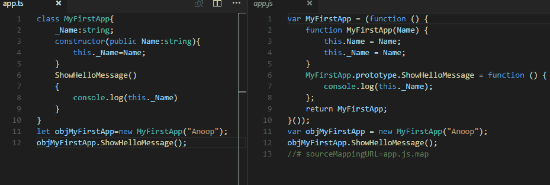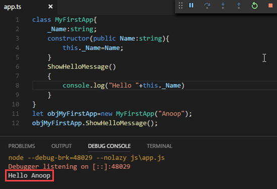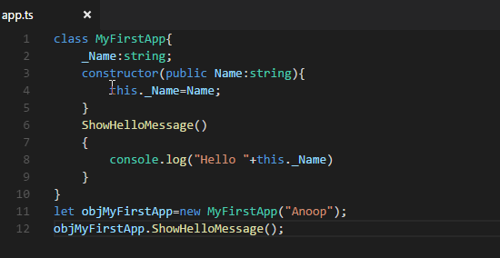 Here, I have created a class with a constructor which takes name parameter of type string and a method, which prints Hello [Name] as an output on the console. Subsequently, I created objMyFirstApp object of that class and invoked ShowHelloMessage (We will learn in depth about each thing in my upcoming article on TypeScript).