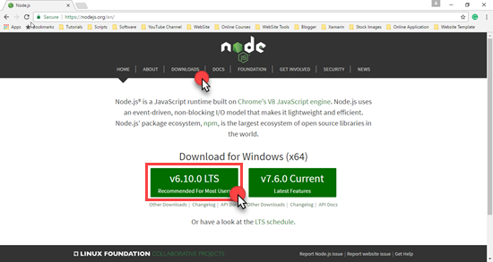 https://nodejs.org/en/ and Download Node.js (which is a JavaScript runtime built on Chrome’s V8 runtime engine).