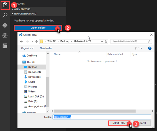 After installing, click Explorer icon and then click Open Folder. I have created a folder named as HelloWorldinTS. Click Select Folder.