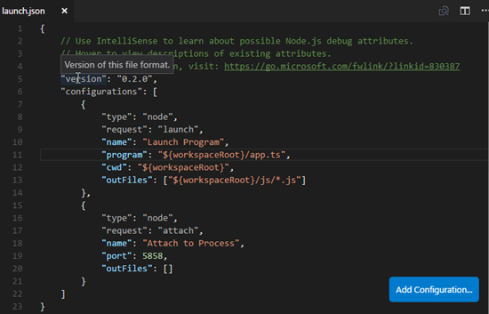 Visual Studio code supports debugging a program in launch or attaching it to the already running program. Here, I mentioned the program files and outFiles location in launch.json file.