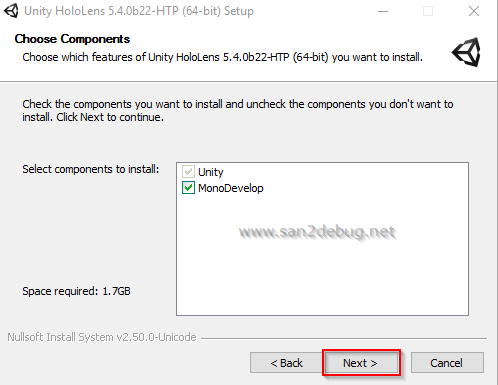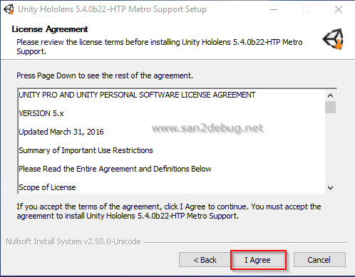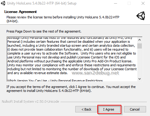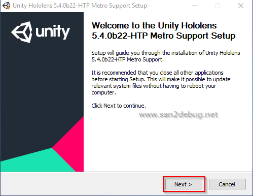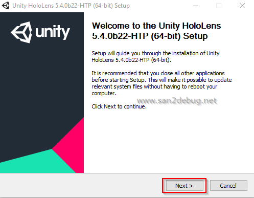 The Unity HoloLens 5.4.0b22-HTP (64-bit) Setup window will be open, then Click Next button.