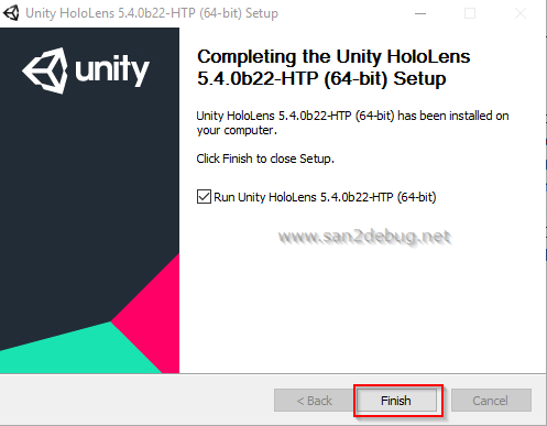 After successful installation of the Unity HoloLens software component then Click Finish button.