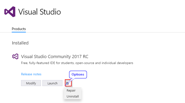Visual Studio products Window will open and click Options. You can choose repair or uninstall Visual Studio 2017.![]()