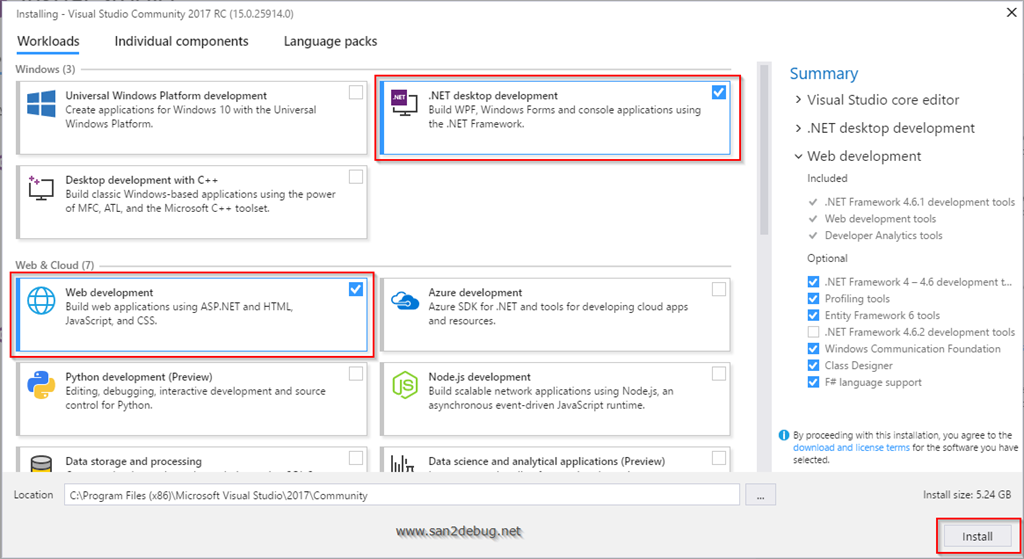 You have to choose the required workloads, as per the screenshot given below. In my case, I have selected .NET Desktop development and Web development workloads. I have continued the default location for the installation. Click Install button.