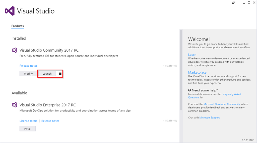 After successfully modifying Visual Studio 2017 Community 2017 RC, click Launch button.
