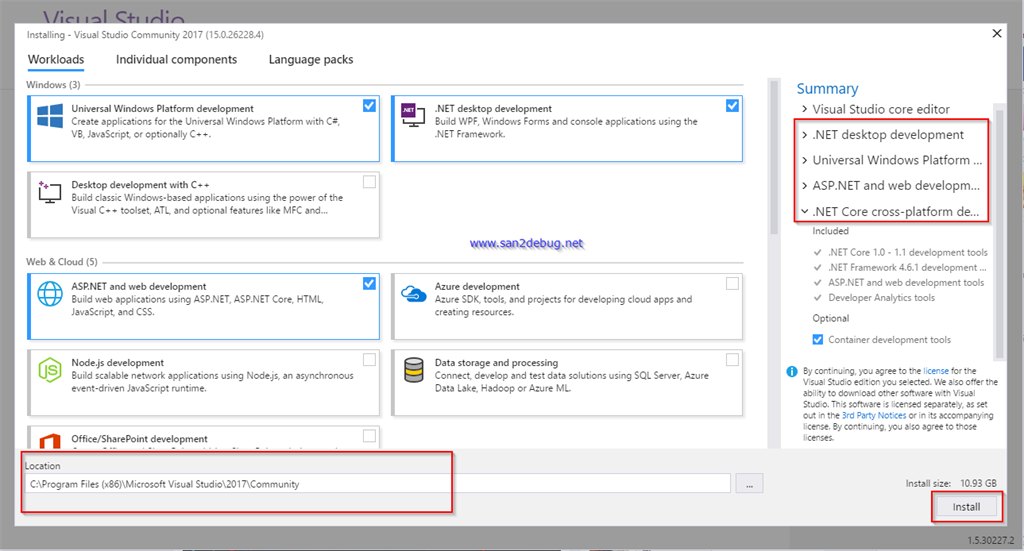 Installing Visual Studio Community 2017 Window will open. You have to choose the required Workloads, as shown below. In my case, I have selected .NET Desktop development, Universal Window development, Web development and .NET Core cross-platform Workloads. I have continued the default location for the installation. Now, click Install button.