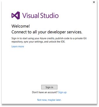 - You can either sign in with the Microsoft account or click on ‘Not now, maybe later ‘ which will straight away start VS for you.