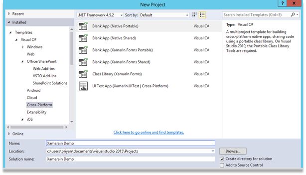 If we go to the Cross-Platform tab we can find the Xamarin templates which can be used to get started with cross platform native apps.
