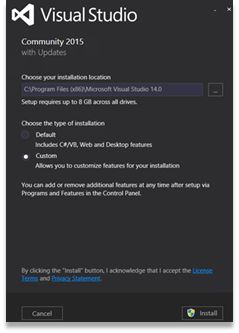 - Choose the installation location and Select Custom. If default is selected Xamarin templates won’t be installed. Click on Install.