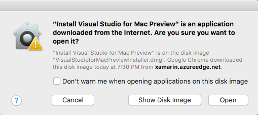 - Double click on ‘VisualStudioforMacPreviewInstaller.dmg’ to open the screen, shown below.