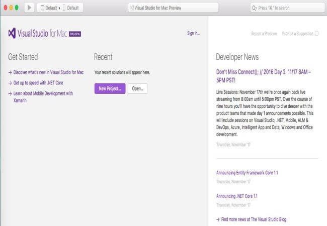 - You will get to the below screen on clicking "Start Visual Studio" button, which will remind you of Visual Studio for Windows (if you have used it).
