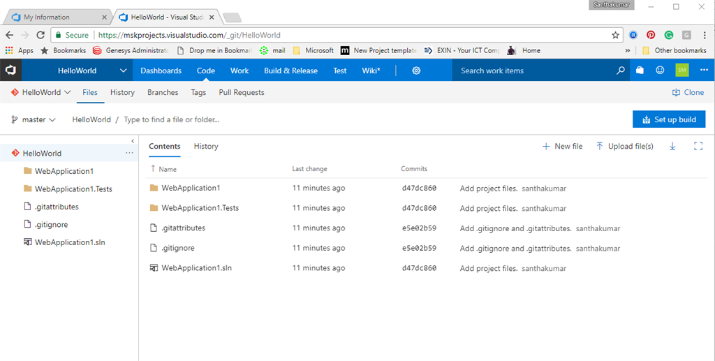 After successfully publishing source code to VSTS, you can see the all the source code files in the respective project of VSTS
