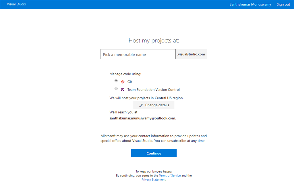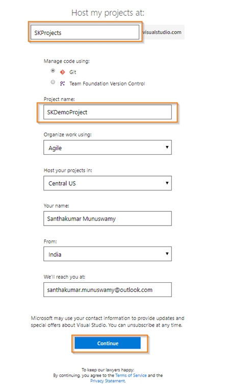 If you want to change above details such as manage code, organize work using, host your projects in, your name, from and Email but in my case I didn’t change those details. Click Continue button.