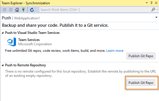 We already created Git repository in VSTS. So we can do push to remote repository now by clicking Push Git Repo as show below