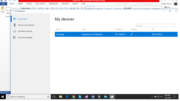 If Pi is successfully booted, you will see your Pi in IoT dashboard under "My devices". I have renamed my Pi Groovepi.