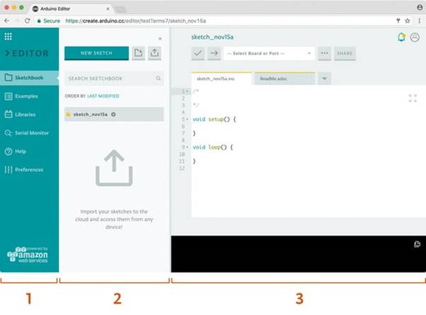 After logging in, you are ready to start using the Arduino Web Editor. The Web app is divided into three main columns.
